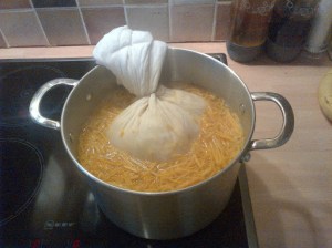 Almost everything was to hand, except muslin, Google came in and after a few minutes looking at various options, a well known supermarkets baby section provided the desired result, cheaper than a cooking shop and on the shelf!