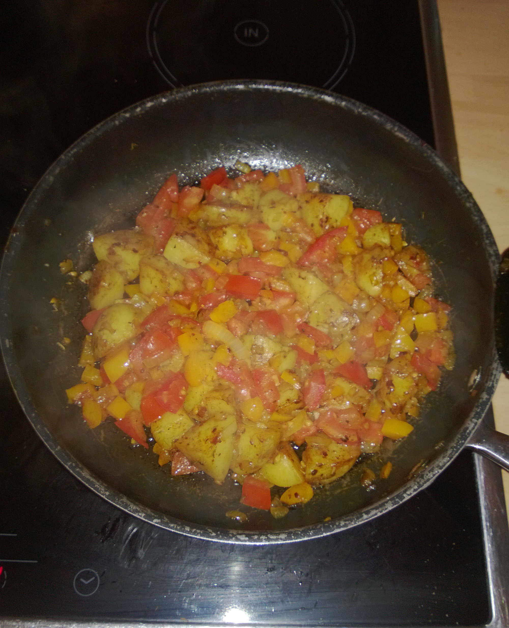 Cook for a further 10- 15 minutes to soften, then add a couple of fresh chopped tomato’s and season with sea salt and pepper, mine looked like this;