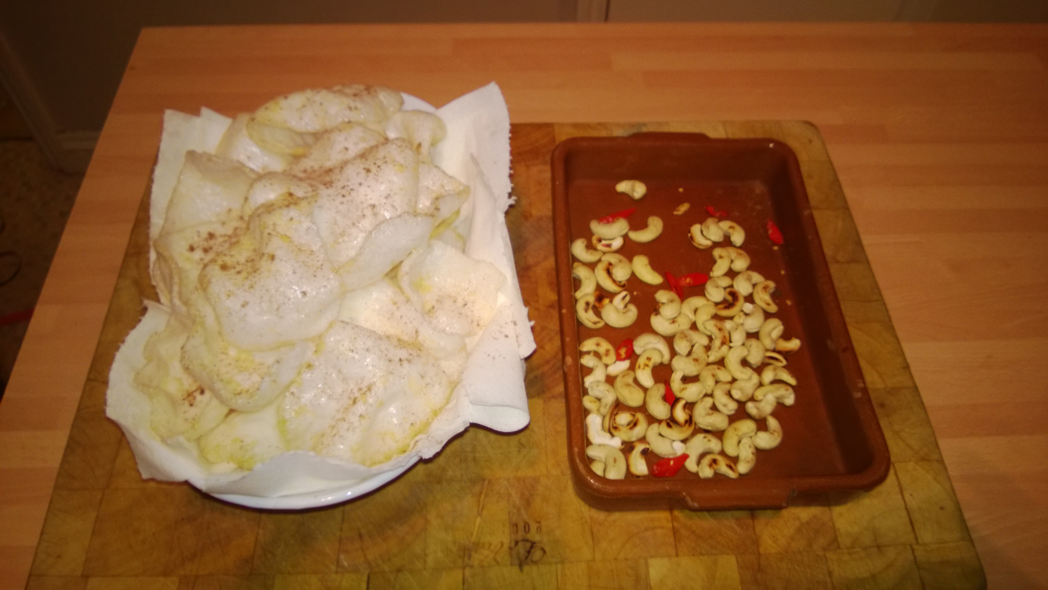 WP_20131201_005 To add some further texture elements I dry fried some Cashew nuts and Red Chilli for a bit of punch, and fried some prawn crackers and dusted with 5 spice powder to accompany the ribs. All you need to do now is serve the meat/rice/sauce and vegetable on a warm plate and experience a tasty, sumptuous exotic meal, all prepared by your own hands and not breaking the bank!WP_20131201_010