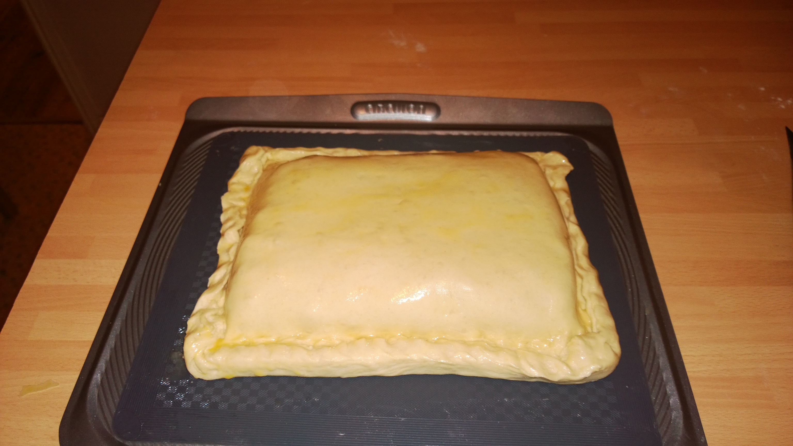 Once you have the base rolled out to a thickness of a slightly less than a pound coin, brush egg wash about an inch around the edge, pile in the chilled filling and place the lid on top. To seal the edges I used the thumb and two finger method to crimp the edge, and then rolled like a Cornish Pasty edge, nothing was escaping this bad boy!