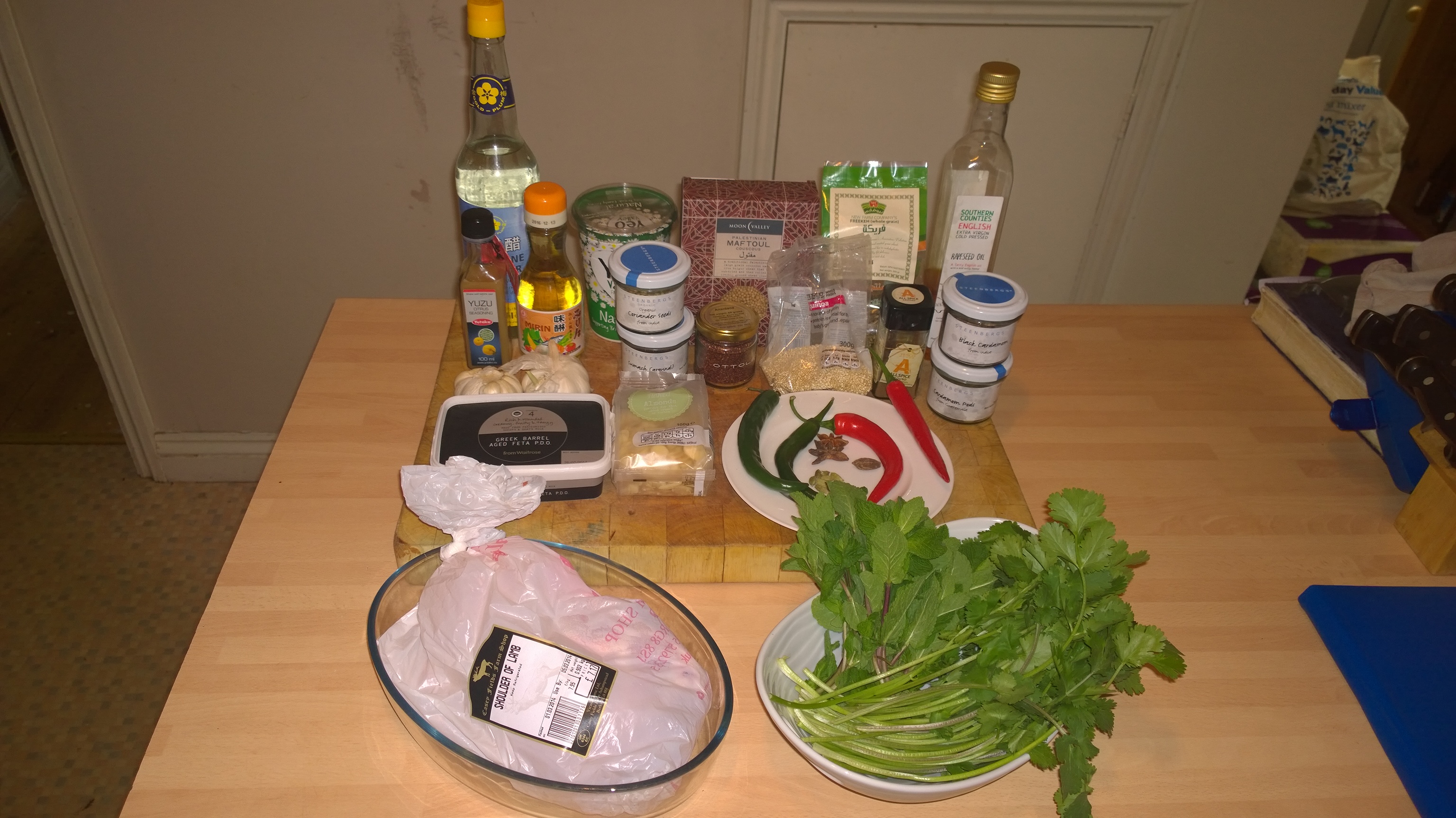 When the lamb is marinated, place in a roasting dish and cover with tin foil, stick in an oven set to 130 deg (fan) 150 deg (convection) and cook for 4 hours till meltingly tender. An hour before the lamb is finished cooking you can start to prepare the rest of the ingredients. Check the cooking instructions on each of the grains, the Maftoul can either be boiled or steamed, the other grains are usually boiled until just tender.