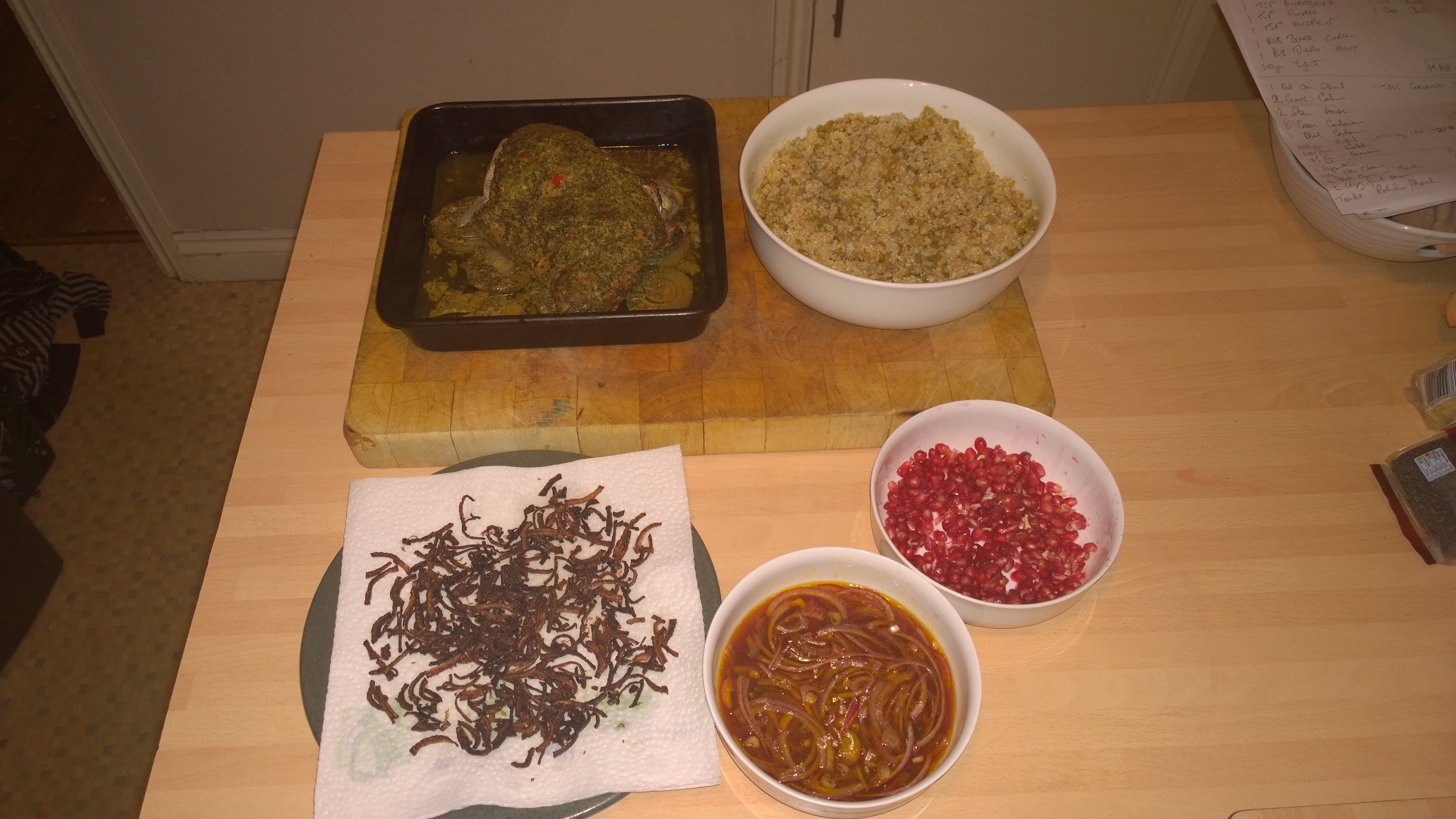 The wholesome is a blend of three grains Quinoa, Maftoul, a Palestinian Cous Cous, and Freekeh; two of these grains are regarded as super foods so this has to be good for you! The protein is a half (or whole) shoulder of lamb that is marinaded for at least 8 hours in a mixture of Yoghurt, Coriander, Chilli’s,  Mint, AnardanaSumac, All Spice and Garlic, and then slow cooked for about 4 hours until tender.