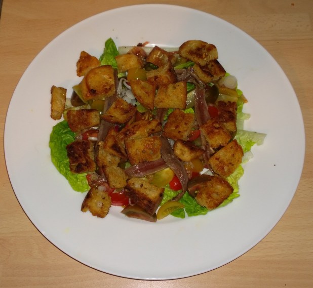 For this quick snack, you will need one of his Caramelised Onion, Cumin and Cheese Loaves, about 4 slices which you need to cube and fry in Butter/Olive Oil and Garlic. This Bread is rich and has LOADS of flavour and forms the basis for my take on a Tuscan dish called Panzanella. Where this version differs is I did not use old Sour Dough, I did not soak the bread, and instead, used flavoursome Bread and fried it adding even more flavour with the Garlic, its VERY good (quote from the Wife!). You can now see where the name from this dish came from!