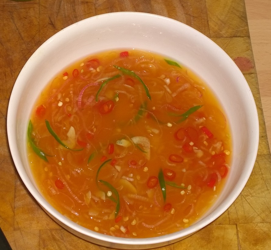 The next stage is to prepare the sauce, this imparts the Sour, Bitter, Sweet, Spicy, Salty which is typical of Vietnamese Cuisine, this is the balance of 5 elements, spicy (metal), sour (wood), bitter (fire), salty (water) and sweet (Earth), corresponding to: five organs the gall bladder, small intestine, large intestine, stomach, and urinary bladder. Its all about the Yin Yang balance and you can find more about is HERE.