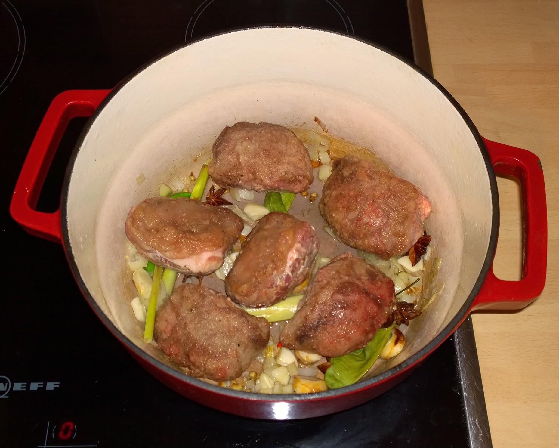 The first step is to put some flour and liberal amounts of Maldon Sea Salt and Pepper in a dish, and coat your Pork Cheeks, then fry them off in some Ground Nut or Vegetable Oil until brown and sealed, set aside on a plate whilst you make the braising liquor. Set your oven to 140 deg (fan) 160 deg (convection) next, this baby is going to slow cook for at least 2 1/2 hours.