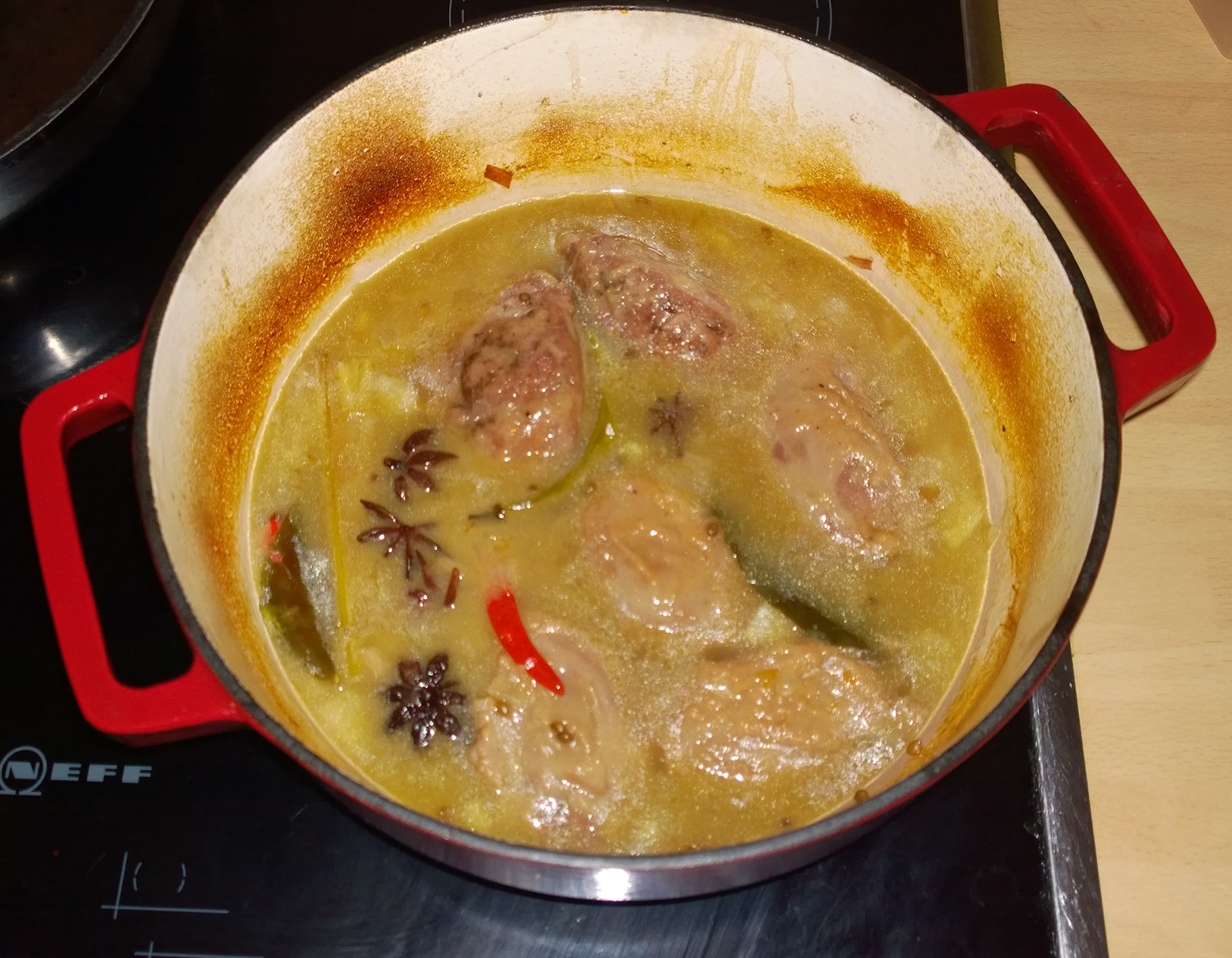 Put some Oil into a Dutch Oven or suitable casserole and gentle fry the Shallots, Galangal, Chillis, Garlic, Star Anise, Lemongrass and Coriander Seed until the aromas start filling the kitchen, then place the Pork Cheeks on top, and add the Chicken Stock, Cider, Rice Wine Vinegar, Nam Pla, Palm Sugar and Kaffir Lime Leaves and gentle stir to dissolve the Palm Sugar. You then need to make a CARTOUCHE, a scrunched up piece of greaseproof paper that you put on top of the meat/liquor pressing down gently so it touches the surface of the liquid, acting like a close fitting lid. Put the lid on top and place into the oven and set the timer for 2 1/2 hours.