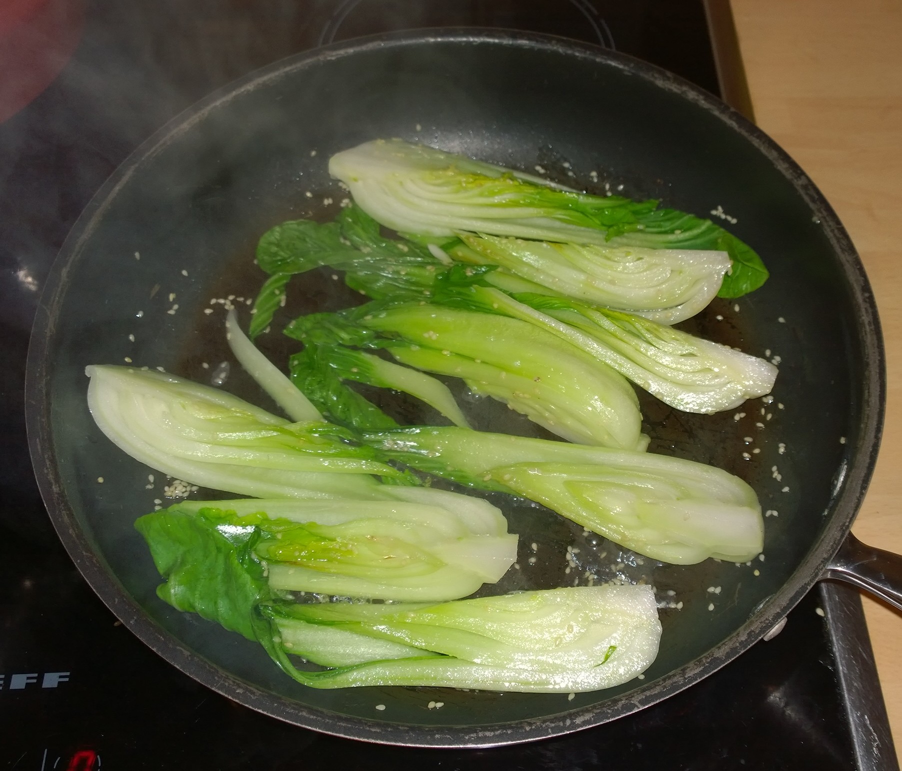 Take a frying pan with a lid, add some Oil on a medium heat and put in your Sesame Seeds to cook for 30 seconds, add the Pak Choy which has been quartered, add a little water to create some steam and put the lid on quickly. I cooked mine for about 2 minutes maximum, remove the lid and CAREFULLY add about 10 drops of Sesame Oil all over the Pak Choy and gentle turn to mix, that’s it done!