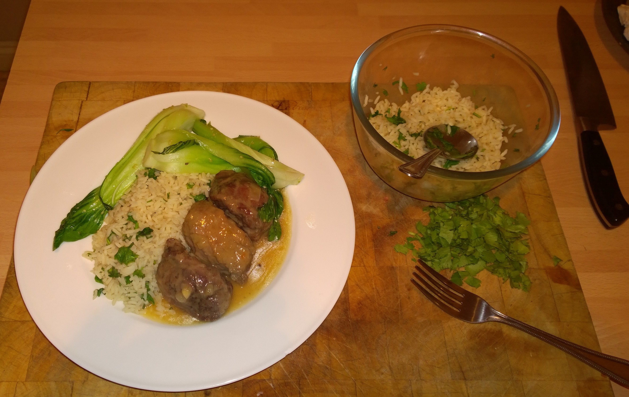 Turn the temperature down to low, we are nearly ready to finish the dish. For speed, I used quick cook Rice, which only takes 90 seconds in the Microwave (Gasp, oh no, surely not….Its quick!). The Pork Cheeks are to be served with Plain Rice, that has chopped Coriander mixed through it, and Pak Choy, with Sesame Seeds & Sesame Oil, really easy to do.
