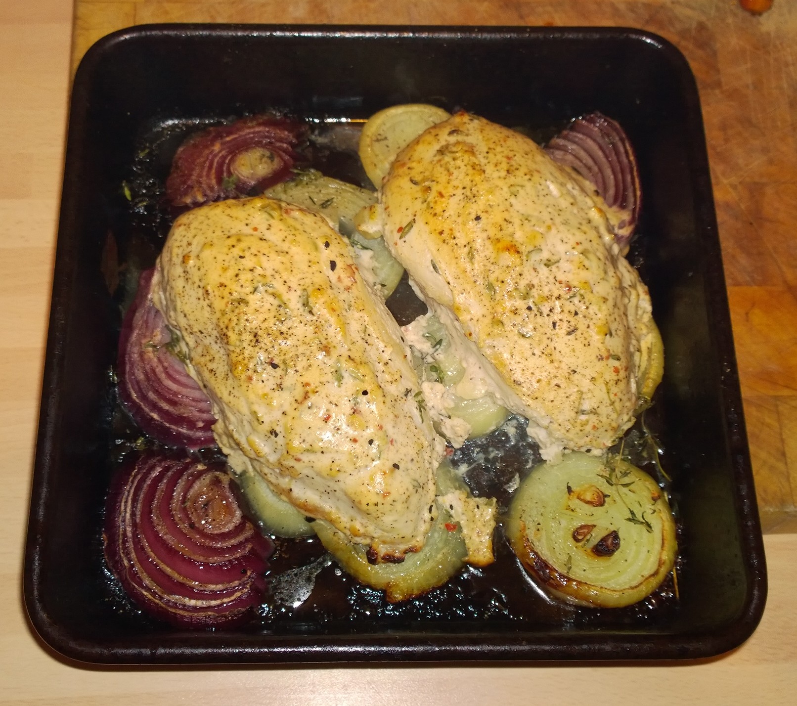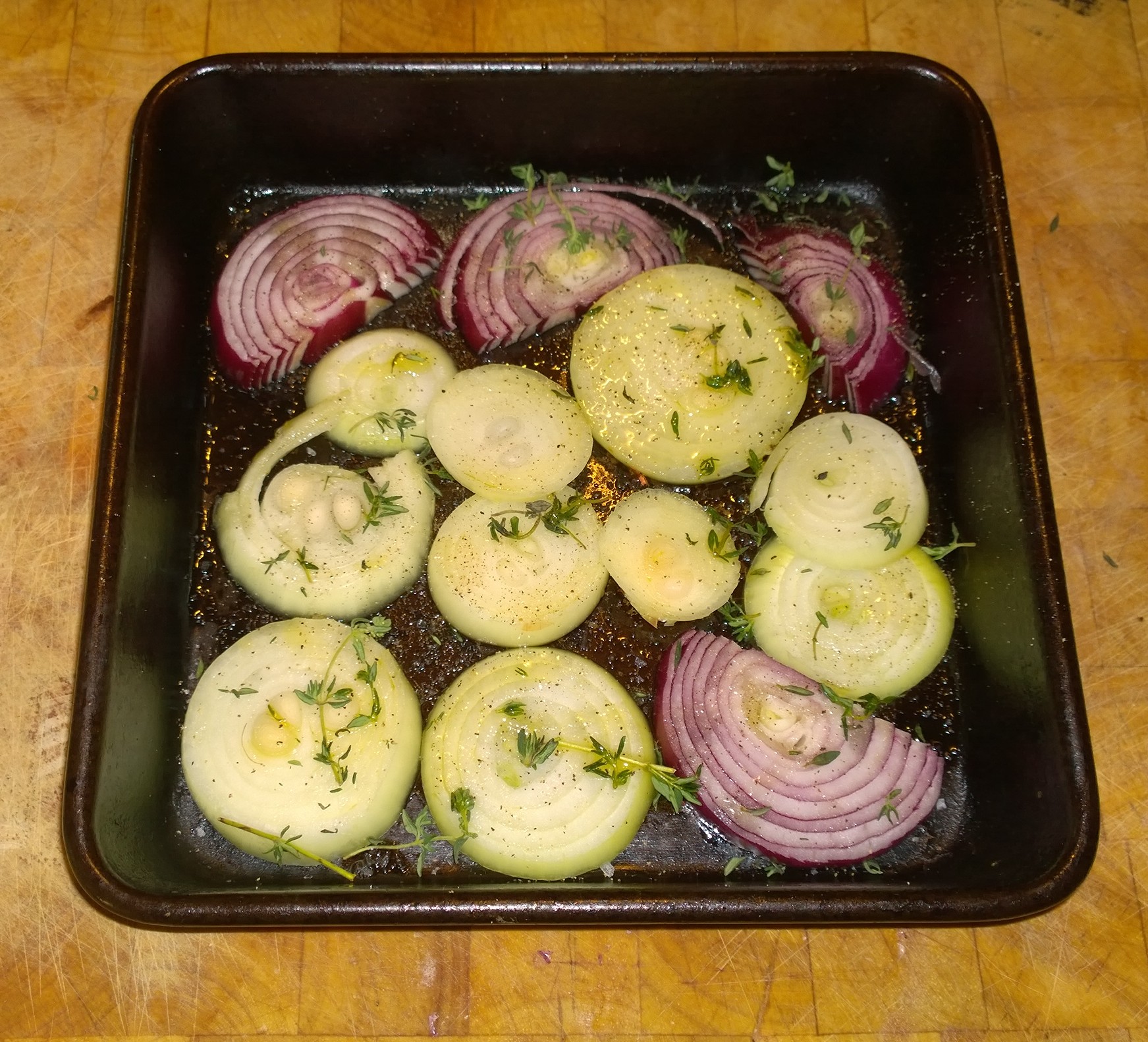 WP_20140518_19_36_37_ProGet a baking tray, drizzle some Oil on the base and placed the sliced Onion on top, season with Salt, Pepper and sprinkle some Thyme leaves on top. Place the marinated Chicken on top and stick in the oven. Depending on the size of your Chicken breasts they will take 15 – 20 minutes to cook, plus another 7 minutes resting time.