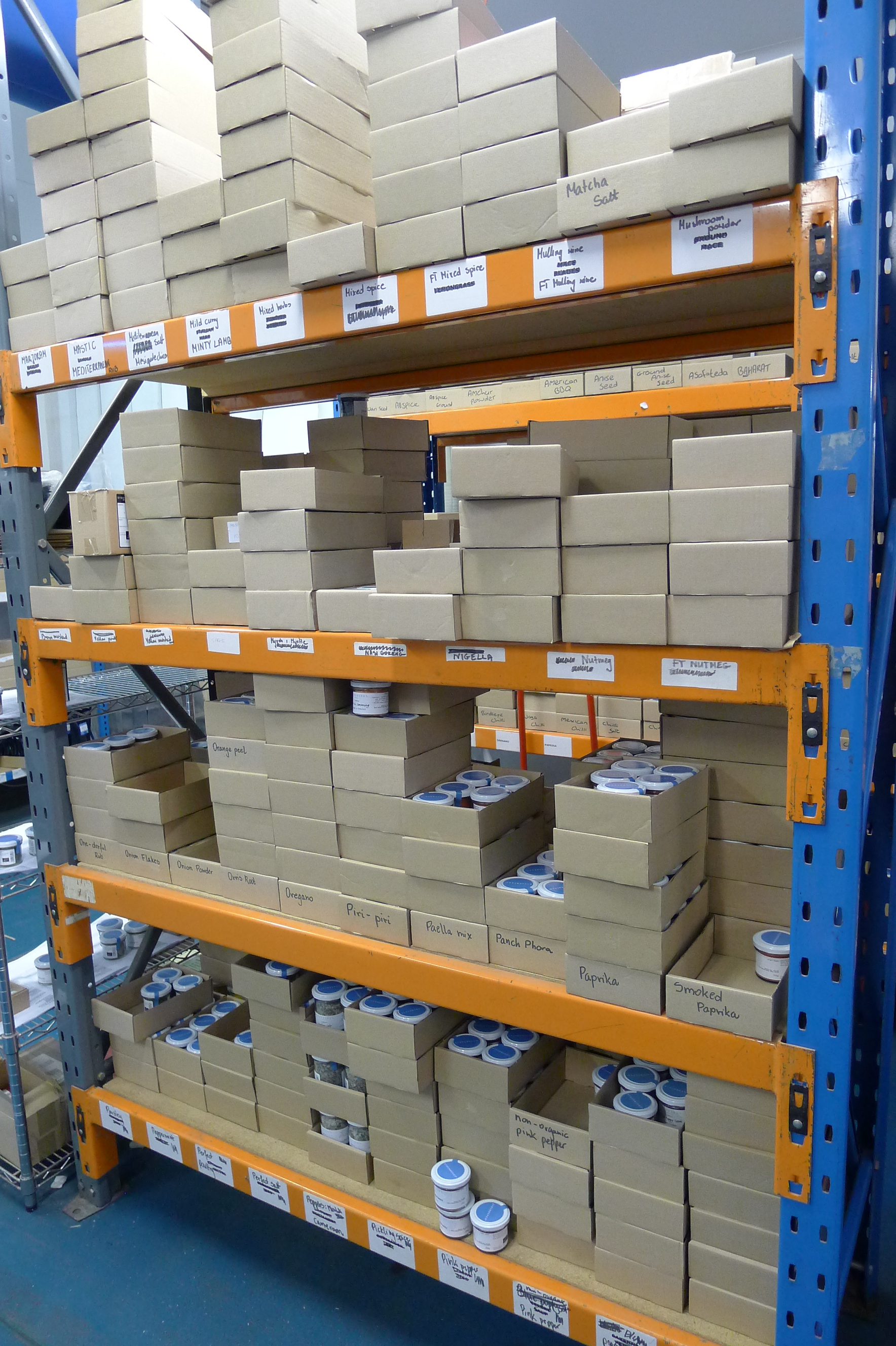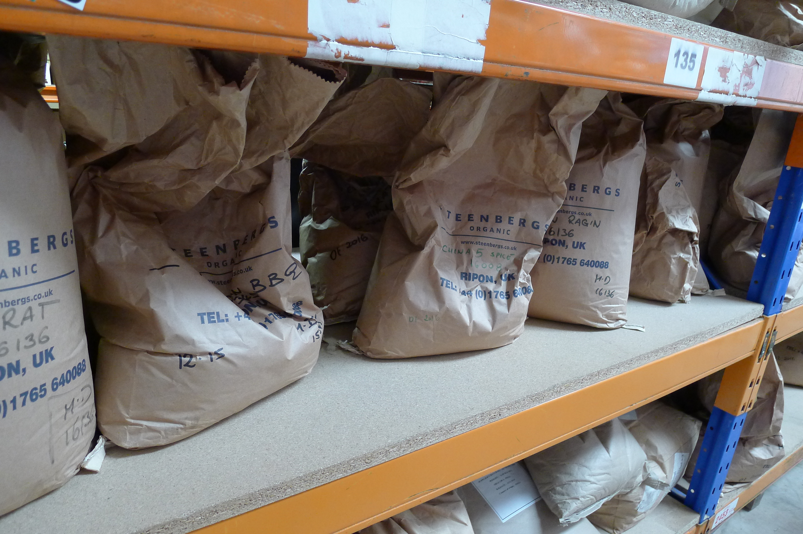 Sourcing Herbs and Spice’s is not easy, as I was to find out from Axel as we went from room to room. It was a 3 1/2 drive to Melmerby, near Ripon in North Yorkshire where Steenbergs are located, after I arrived, I completed the mandatory health/sickness declaration, donned a cloak and hair net, and we started the tour. Sophie, Axel’s partner (in both marriage and business), was busy applying the finishing touches to a box of the distinctive glass jars that are used to store the various products, the final blue seal. Legislation has an interesting impact on importing food products. You would imagine that Cardamom, Pepper, Sumac etc. would arrive in ‘romantic’ hessian sacks, but no, thanks to the EU and other legislative bodies, vacuum packing is the order of the day and the 1st task as soon as a shipment arrives, is to remove the plastic to prevent the product from sweating and going off!