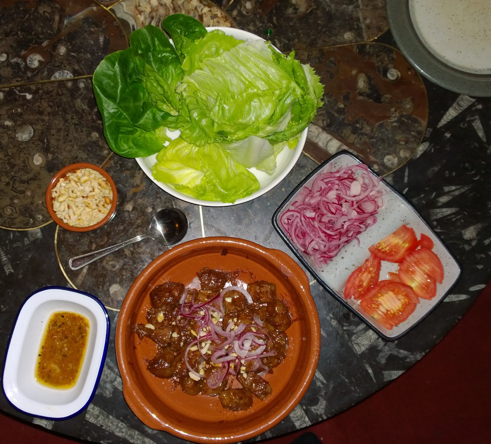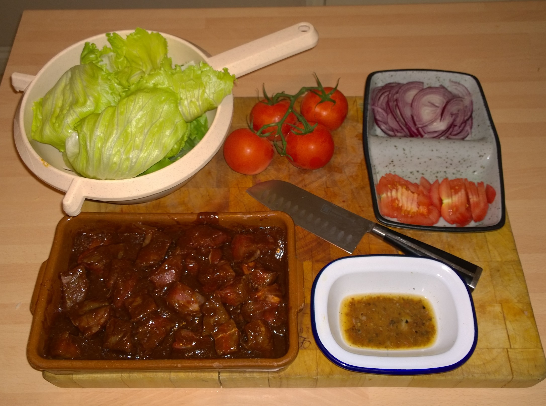 The Lettuce (Iceberg or baby Gem), replaces the Tortilla wrap and forms the container for some Steak, Onion, Tomato and Peanuts, dipping into the Lime and Pepper dressing once rolled up. Its a delicious light, zingy dish, quick to make but amazingly tasty and moorish.