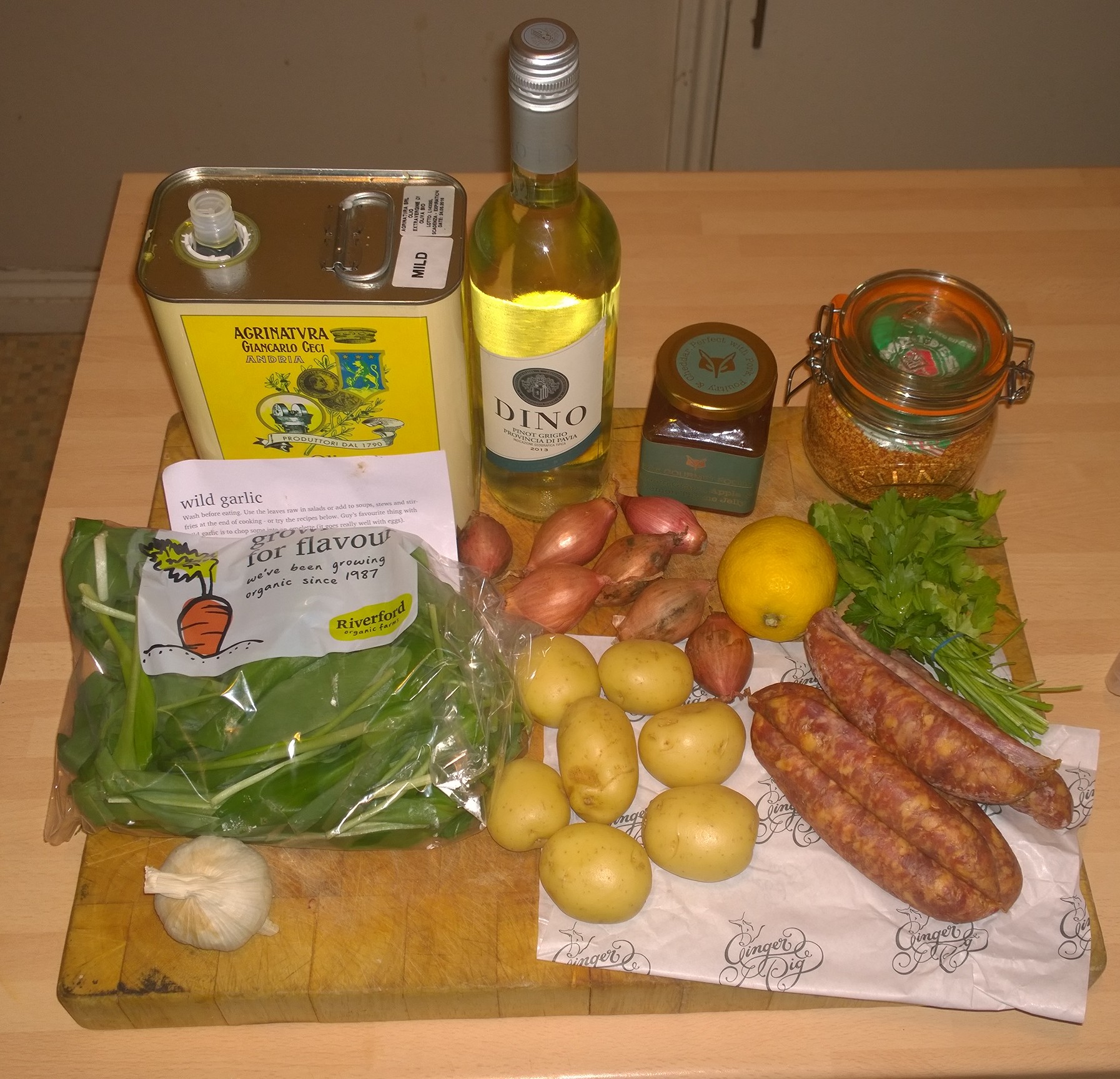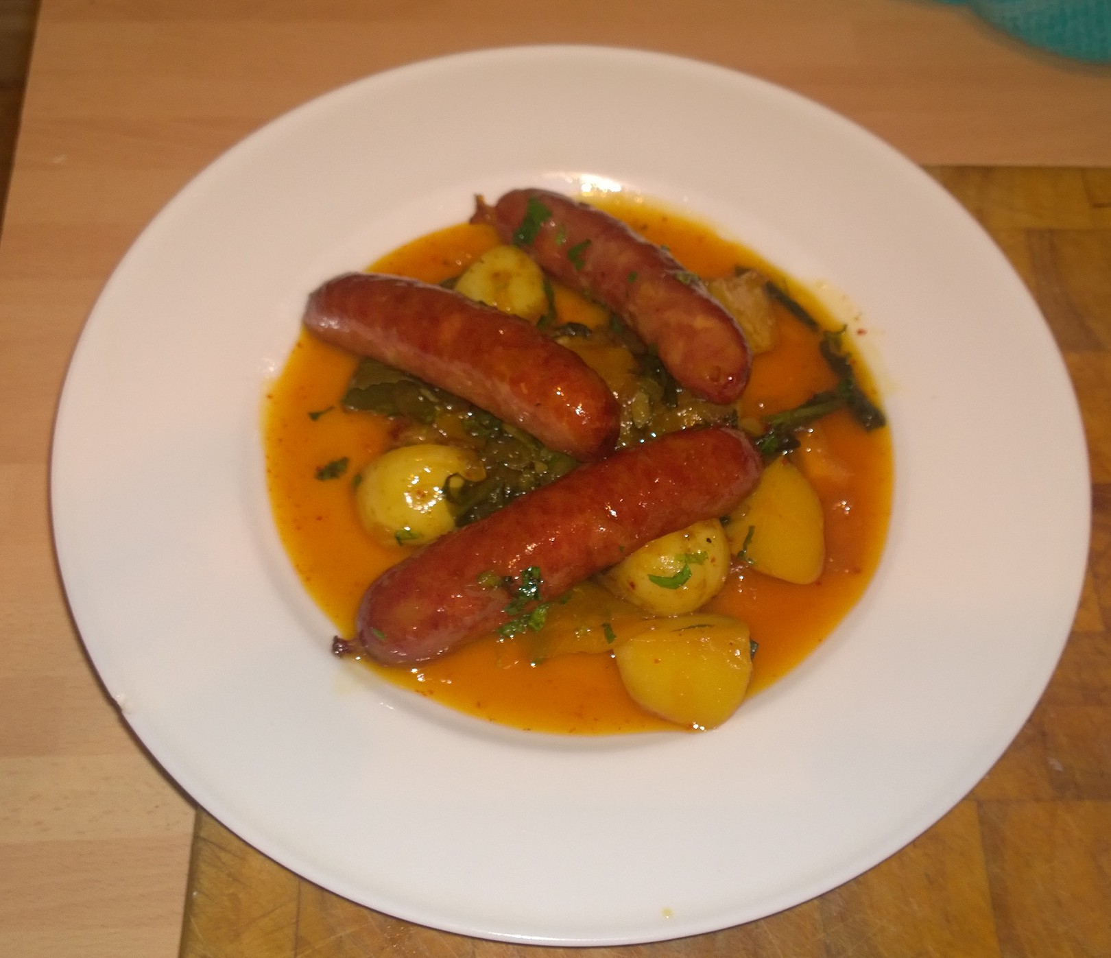 So, for this take on Sausages with Potatoes and Lemon you will need the following (as per the picture at the head of this post, adjust the vegetable volumes by eye/sense);