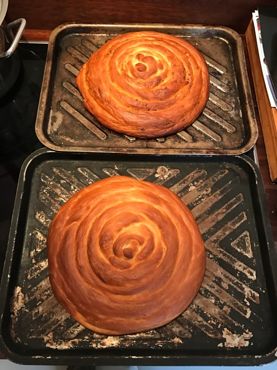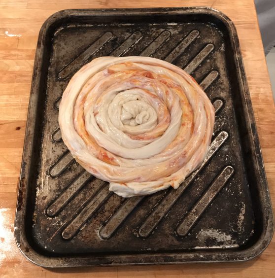 You have to stretch the Ensaidmada before ‘gently’ coiling and allowing to prove for a couple of hours, traditionally this would be done overnight to develop more flavour but our time was limited. Once risen it goes into a hot oven until a deep brown, not the light golden colour we are normally used to when baking.