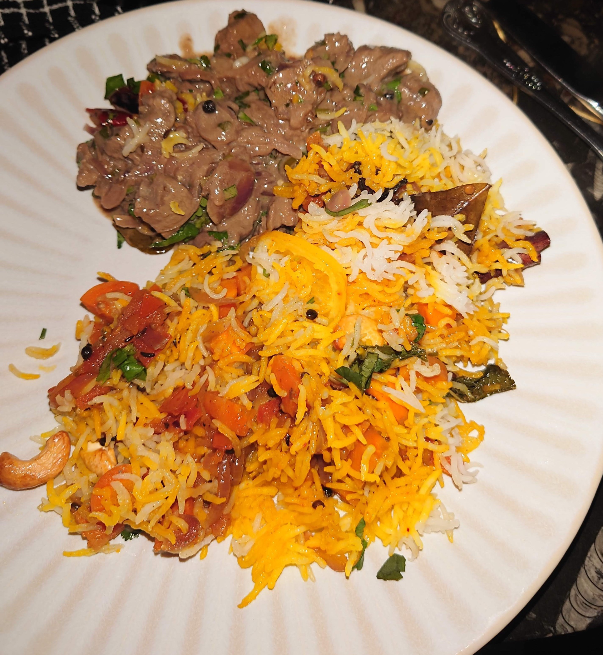 I kept the Railway Curry on a low heat whilst finishing the Biryani, I could not manage to synchronise my cooking well enough but there was only about 10 minutes between finishing the Curry and the Biryani being ready, it did look good, even if I say so myself.