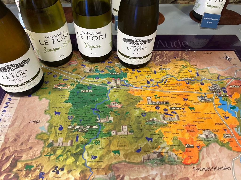 I have visited Domaine Le Fort before, and tried its award winning wines, but not the latest addition, THE best Chardonnay in the World 2020. It’s in a lovely location, near to the village of Bram, about a 20 minute drive from The French House Party HQ. We were greeted by Stéphanie one half of the family double act that are responsible for producing a seriously good range of wines from the Languedoc region of France, you might recognise some of the names on the map above.