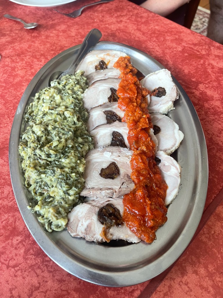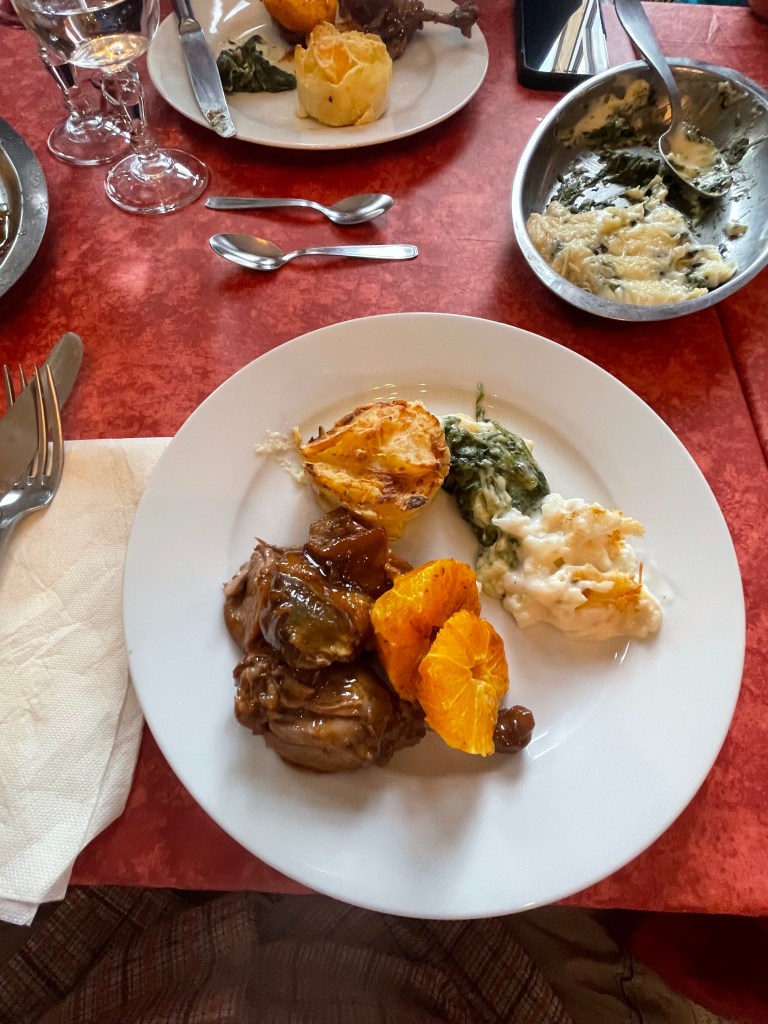 I’ve come to appreciate the simplicity of french cuisine in this part of France. Whilst we were having 3 course meals, twice a day most days they were not massive portions and this main dish was all served on one platter, the lamb, a mushroom egg ’flan’ and stuffed tomatoes, no heavy starchy potato stuff but all delicious.