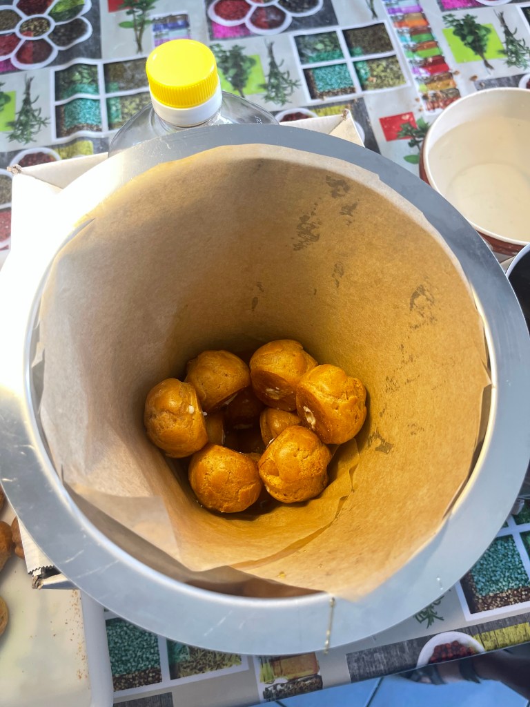 We could have spent hours making the Choux Buns, making sure they were all the same size and weight, but to save time we had a box of the Buns, pre-made, all the same size, so just had to make the Pastry Cream, make a hole in the base of each bun, pipe in the cream and weigh them again. Dipping the filled buns carefully and placing them in the mould and soon we had our structure, Bernard gently poured the remaining caramel to help fix the interior of the Croquembouche to make sure it was stable.