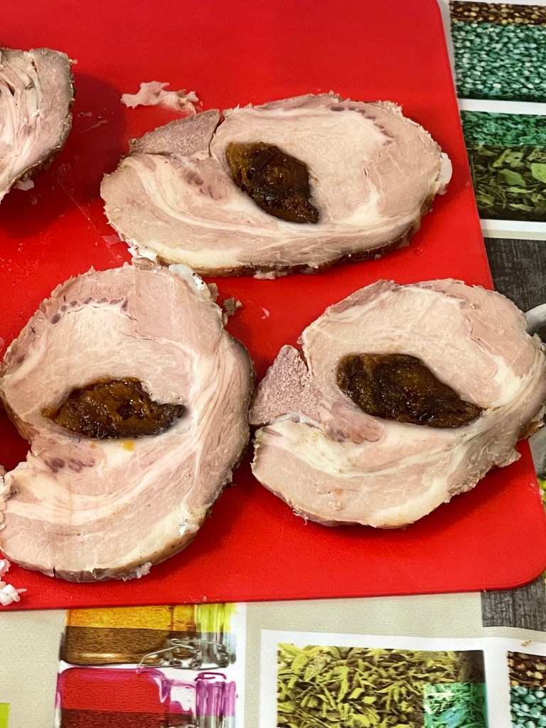 Please excuse the legs as it was hot. Here we are tackling a saddle of lamb, opening it up, carefully removing the central bone and ’tenders’ ready for adding herbs and spices and rolling and tying, before cutting into noisettes ready for cooking, they were very tasty.