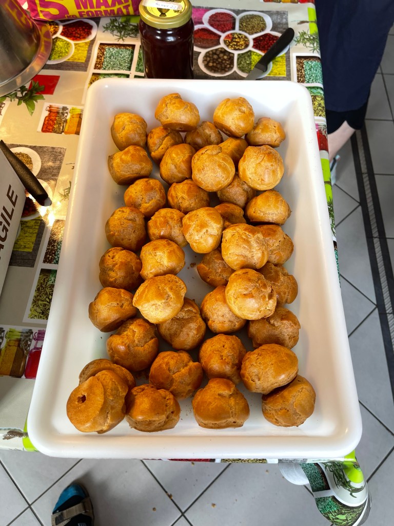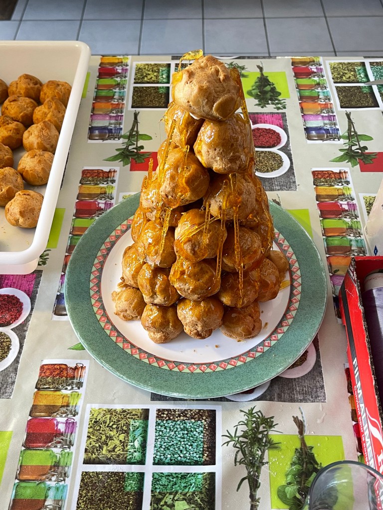 Next was Pièce Montée, in our case a Croquembouche a centre piece used at special occasions, a celebration, I have made one of these before, mind your fingers on the scorching Caramel. It’s a simple, but again extremely tasty affair, small Choux buns, filled with Pastry Cream and attached with Caramel, using a lined cone as a mould.