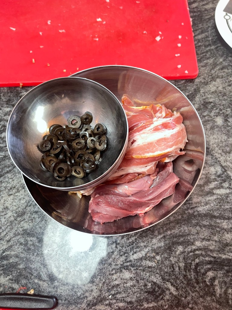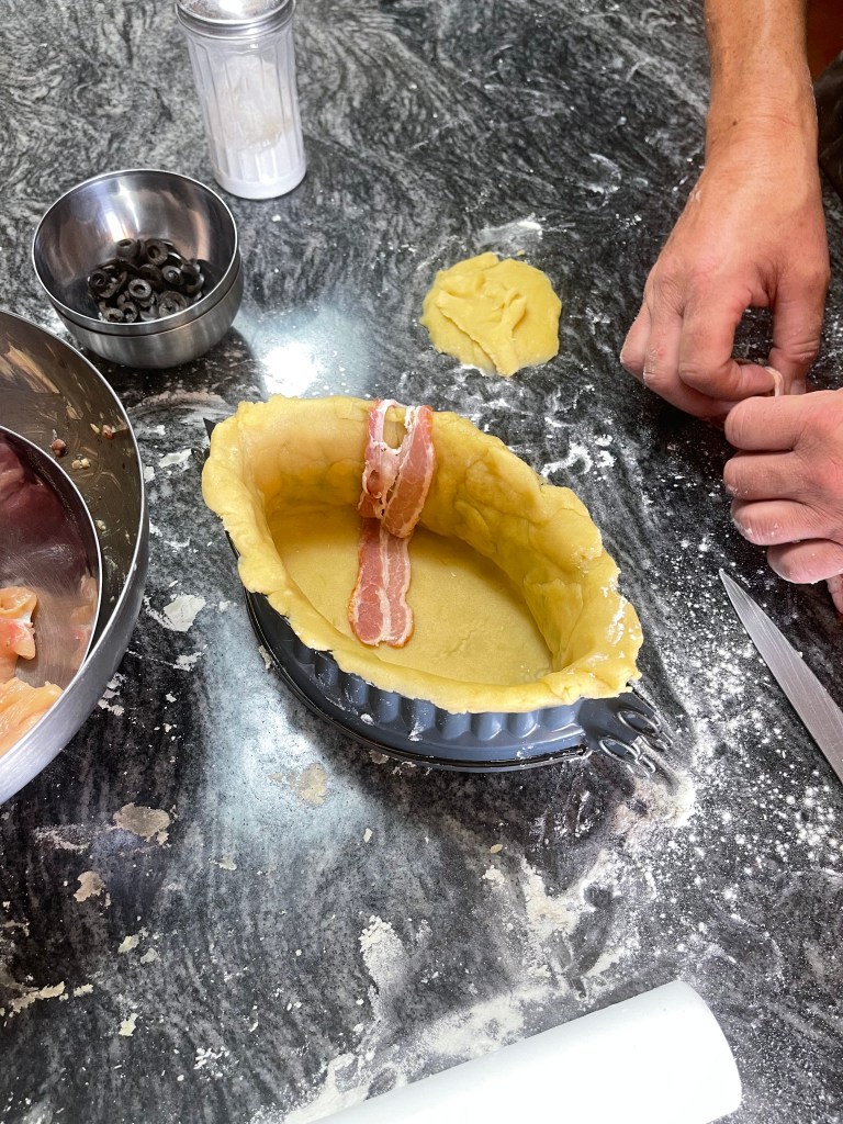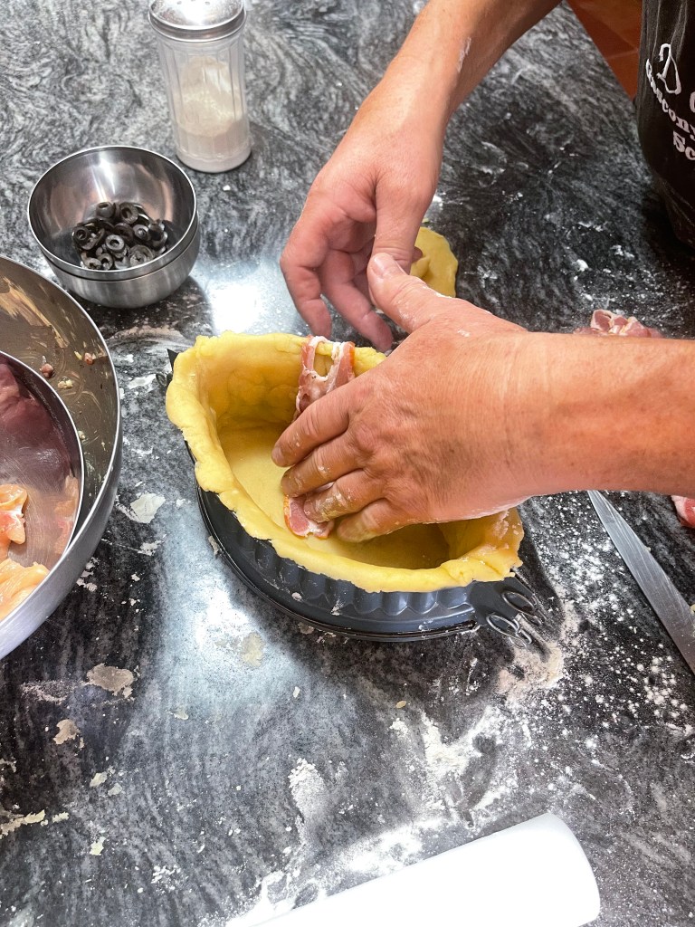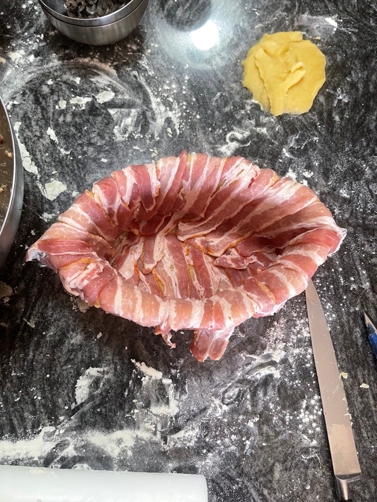 Unlike UK raised pies this one did not use a Hot Water Crust Pastry, but a different recipe that produced a very delicious result. There were quite a few stages to go though as the above pictures demonstrate, making the Pastry, lining the traditional baking tin was tricky (very expensive to buy), stretching the bacon (makes it thinner), lining and filling the pastry correctly, adding the layers it took us a while to create the masterpiece that ended up on our plates later that day, it was intensive, everyone was concentrating but having great fun at the same time.
