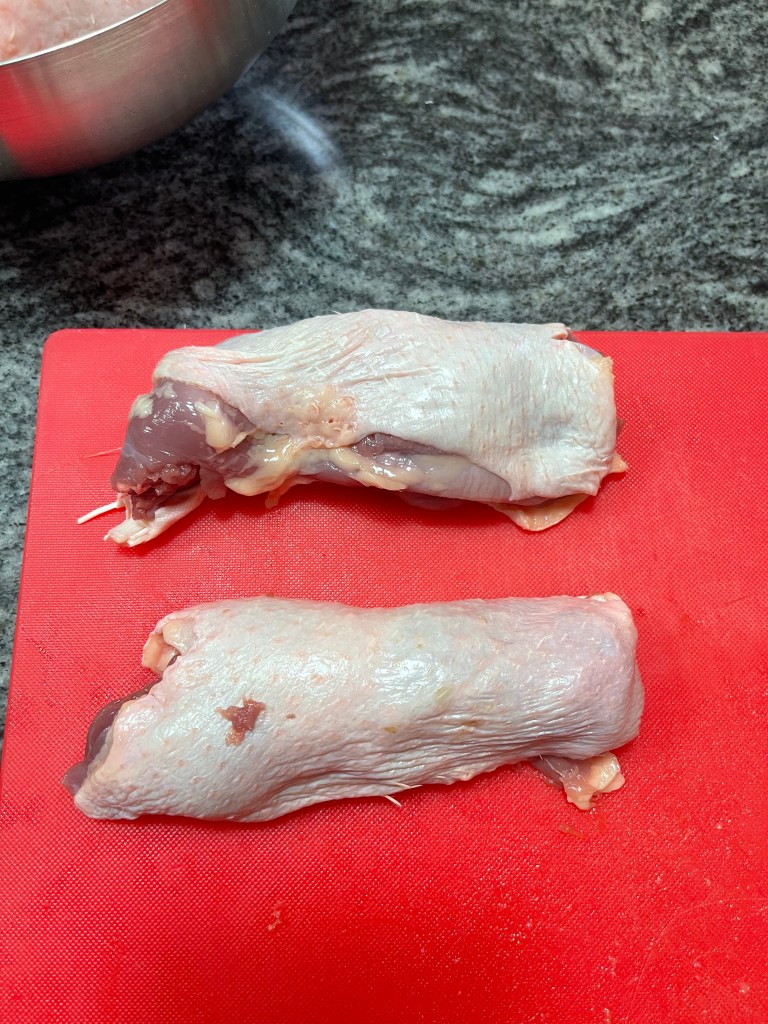 Another dish on the menu was Tunnel Boned Duck Leg, stuffed with Lemon Grass and Ginger, then rolled and wrapped in a butter soaked Muslin, there are several tricks to this dish, go on the course to find out more. David showed us how to remove the bone from the leg, we then set about trying ourselves carefully using our paring knives to keep as much of the flesh that we could, and importantly keeping the skin intact.