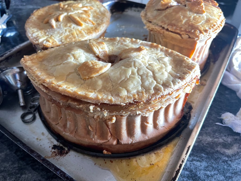 During the cooking process the contents expanded so if you had overfilled your pie, it pushed the lid off. Luckily, the pie Rad and I had produced was ‘on the cusp’, very proud we all were of our creations, very impressive work indeed. I mentioned the Tins, only + £100 each! I just checked one of my quality cookery suppliers and a decent non-stick retails at £129, maybe one for the Christmas list 😀