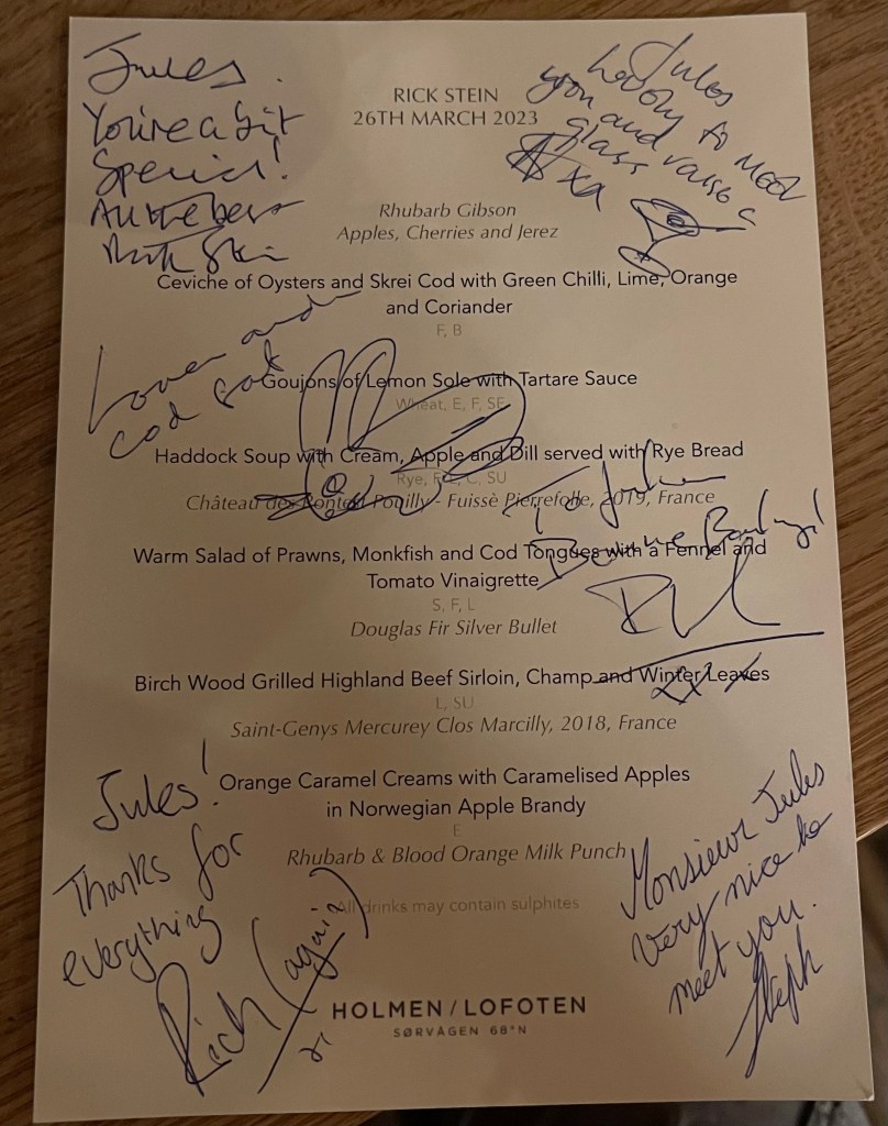 There was a hive of activity in the kitchen, more so it seemed than usual, it was the last night, the last supper, A Rick Stein banquet with all sorts of delicious food, and the brilliant Nick Strangeway supplying delicious drinks to match it was going to be a great evening. Throughout the week, the place settings had been moved about so attendees got to sit and mingle with different people which was really nice. I couldn’t see my name anywhere, until I went over the chefs table and there was my name, I was on the top table on the last night, With Rick, his wife Sass, my good friend Richard Bertinet, Nick Strangeway and when he wasn’t in the kitchen, the maestro Rick Stein, what an honour and privilege, I couldn’t believe it.