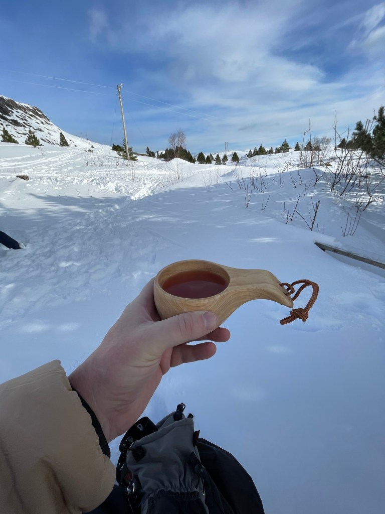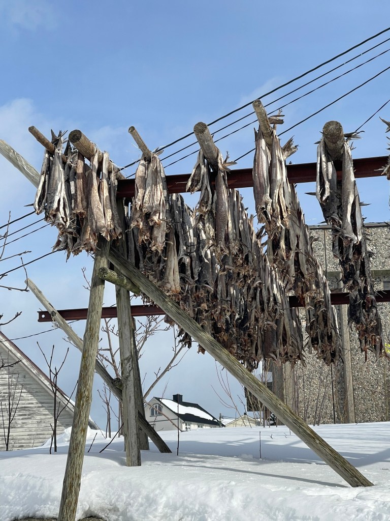 After enjoying a thoroughly delicious hot fruit tea, served in traditional wooden cups we headed back to Holmen, stopping by racks of Cod drying in the cold dry crisp air, a local tradition on Lofoten, the smell was obvious, heady and pungent.