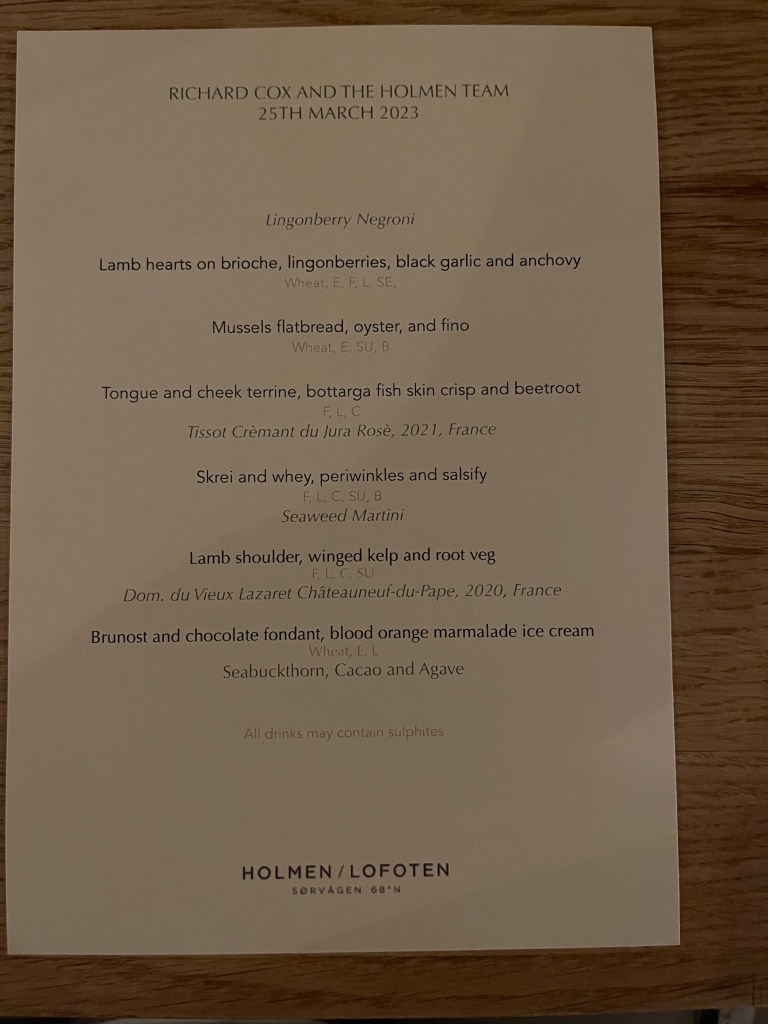 The talent of the Holmen kitchen, with Richard ‘Coxy’ Cox at the helm was inspiring and just brilliant. If you look at the menu above, Tongue & Cheek Terrine, Bottarga Fish Skin Crisp and Beetroot was standout, and Skrei and Whey, Periwinkles and Salsify, well everyone was blown away at the quality and inspiration behind the food. Ingunn, Richard’s boss pictured above mentioned on numerous occasions how lucky she was to have found such as amazing calm, and professional chef (no swearing or shouting at anyone, especially staff). He was just brilliant, and a really top bloke!