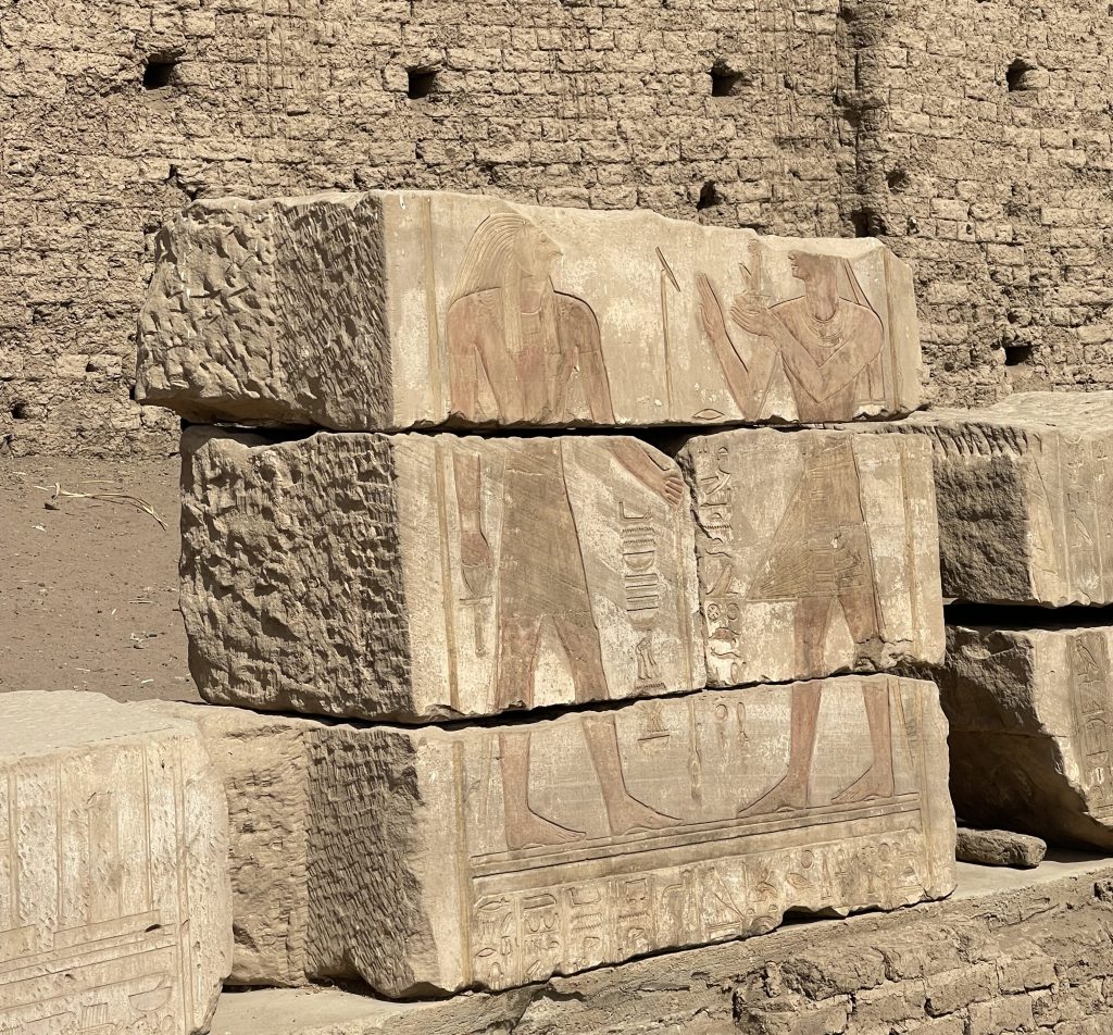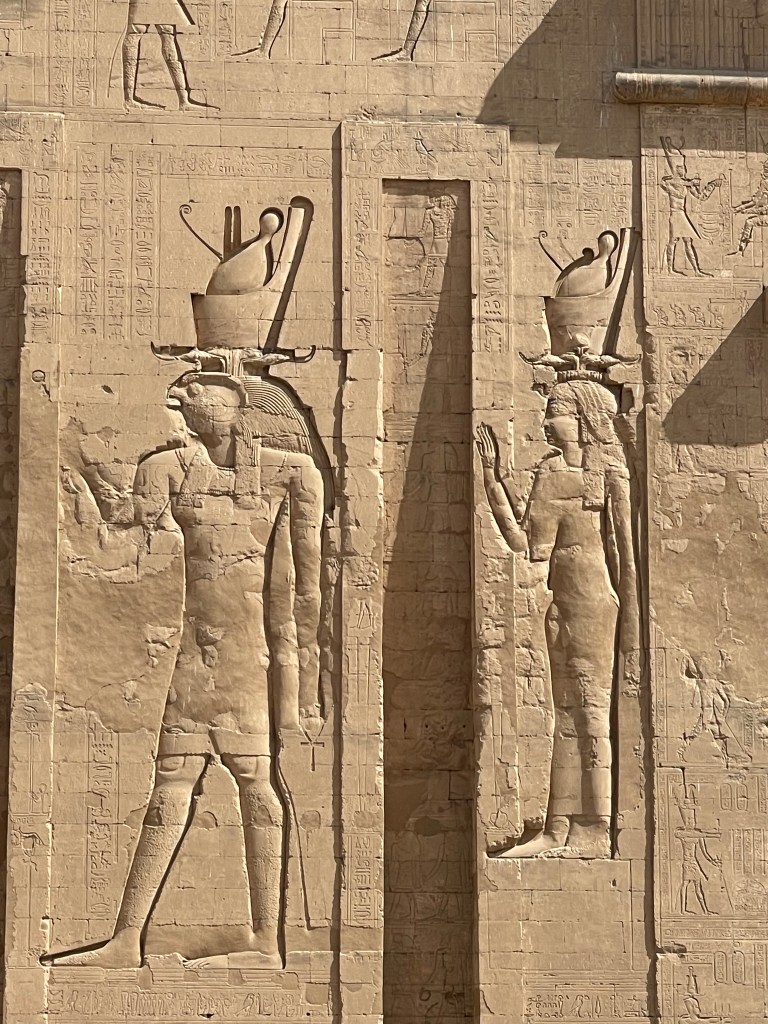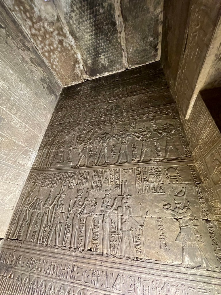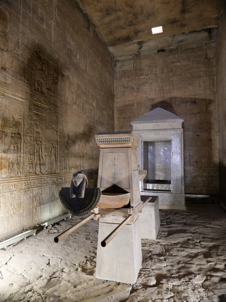 The holiest place, the sanctuary, is accessed through the ante-chambers where Horus’s priests would have left offerings, sitting proudly is a polished granite shrine (above) where the gold statue of Horus would have stood, in front is a replica of the wooden barque used to carry the gold cult statue during festivals, the original is on display in The Louvre in France. There was definitely a ‘mystic’ feeling in the air.