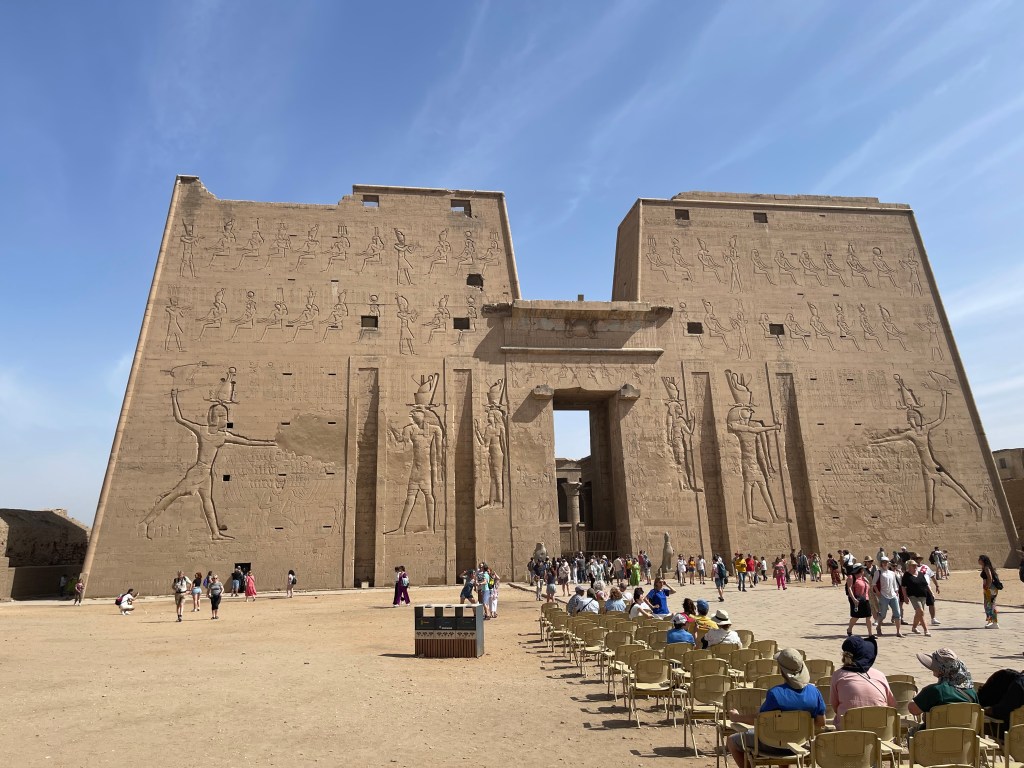 Perhaps the most striking features of the Temple of Horus are the massive pylons that stand at the entrance to the temple. They are 118 feet high, decorated with battle scenes of King Ptolemy VIII defeating his enemies for Horus. Inside the temple are several rooms, with walls covered in ancient writings.