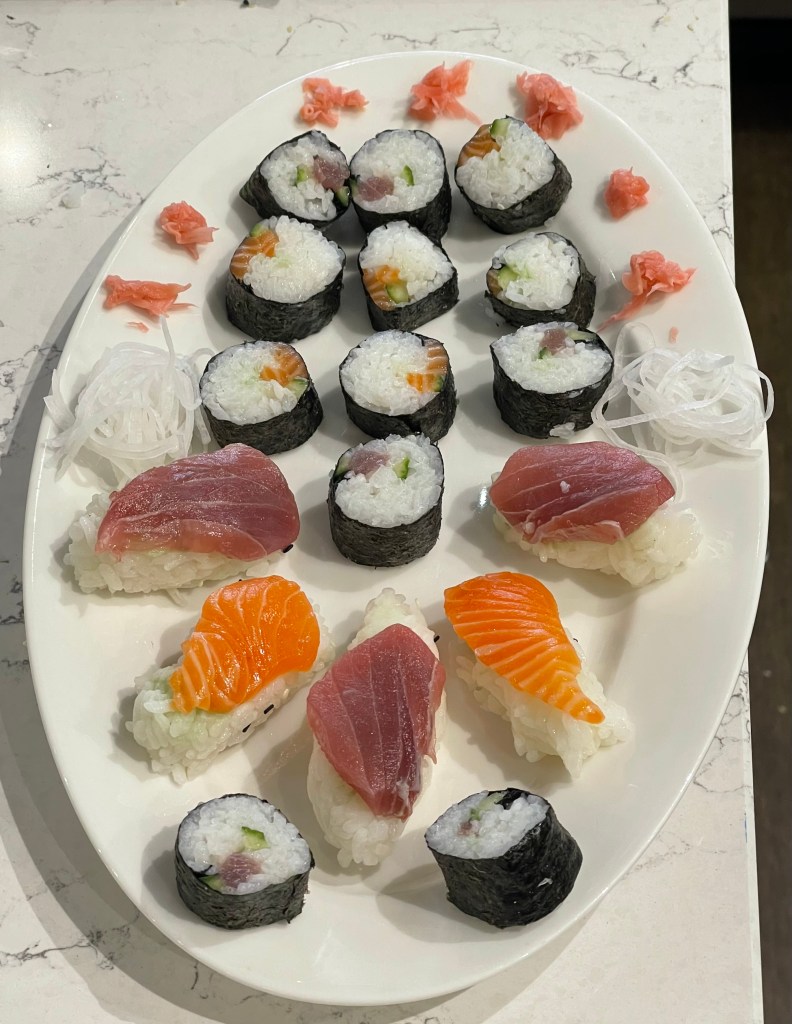 Lets make sushi! Nick gave us a masterclass in making several types of Sushi. Before starting, the rice had been cooked, chilled and seasoned with a mixture of vinegar and sugar. Various styles were created, like Nigiri, a hand moulded ‘oblong’ of sticky rice, with typically, a layer of raw fish. Makisushi, a roll of rice and assorted fillings such as Cucumber and Salmon, or Tuna.