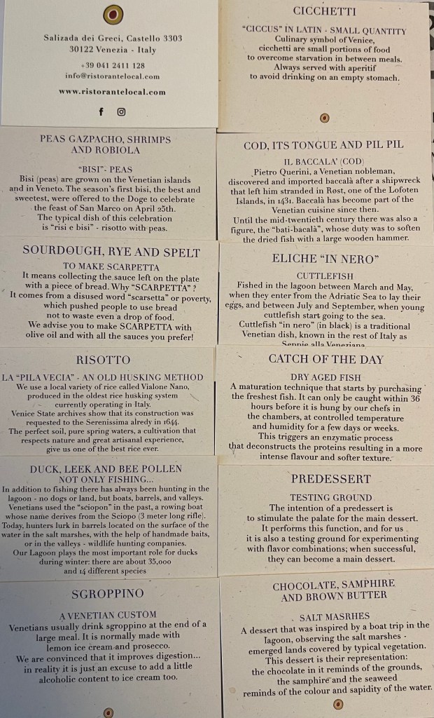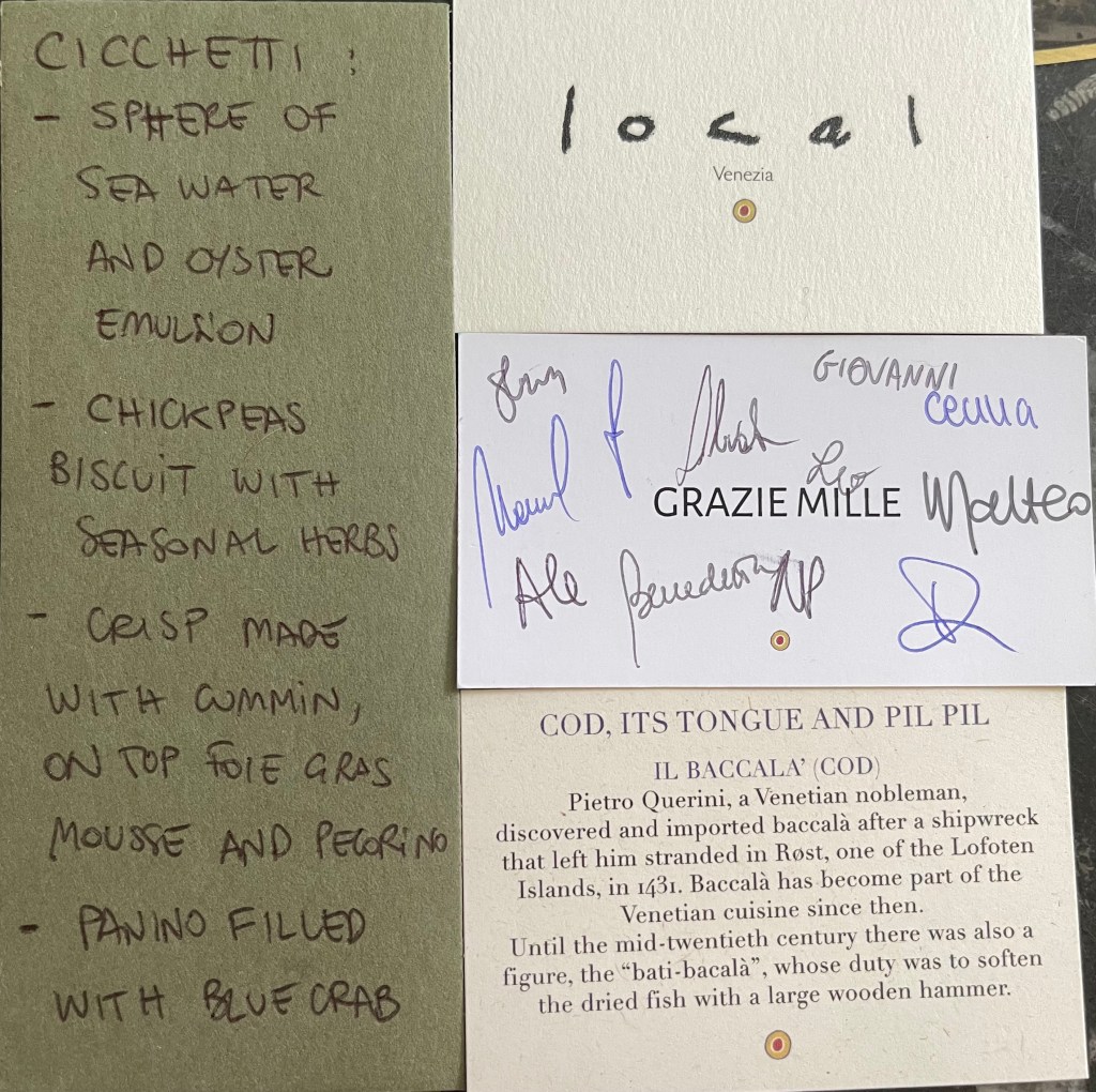 The first course of cicchetti was a stunning ‘mystery’, each item had been eloquently explained but in my excitement, I had forgotten what I had eaten, I could certainly remember each element being sublime, brilliant, sometime unusual but definitely delicious. I beckoned Benedetta, and within minutes, she had kindly written the description of each cicchetti as can be seen above left.