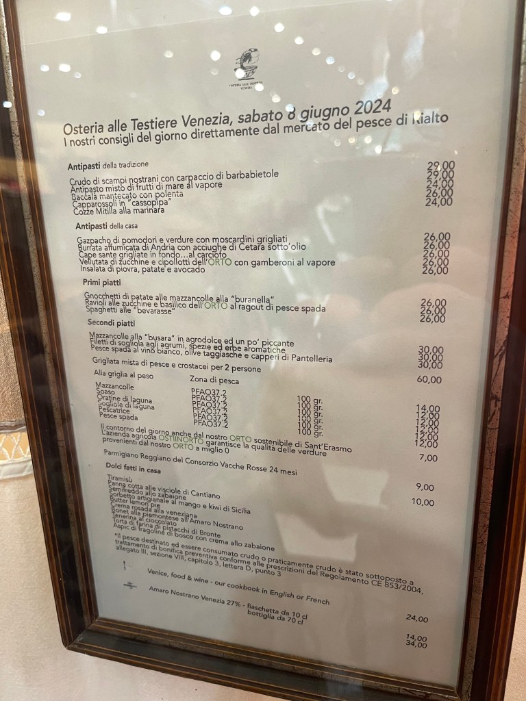 Two restaurants were booked for Tuesday, lunch at Osteria Alle Testiere and dinner at Osteria Anice Stellato. You would not believe (well, probably my close friends would), how much time and effort went into choosing and booking the restaurants, there was only one failure, I sent them a polite email and got no response, disappointing, but there were plenty of others to choose from!