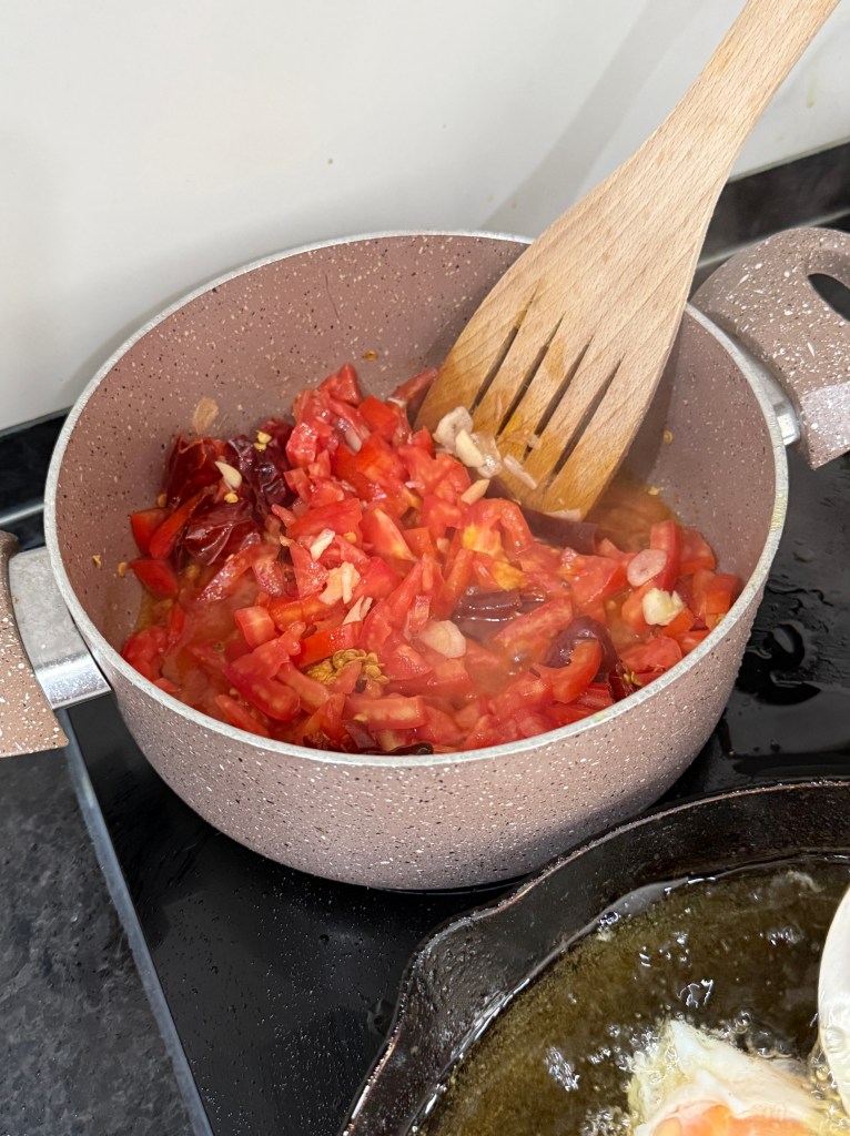 The artistry of Tunisian cooking reveals itself dish by dish, beginning with the bold flavors of ojja. The process starts by pricking merguez sausages with a fork and cooking them separately with some chopped dried chilli, allowing their spicy oils to seep out and deepen their flavour as they brown. Once done, the sausages are set aside, their aromatic fat reserved.