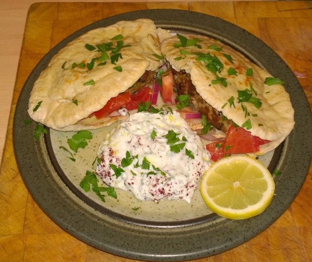 The Pittas were damped with water and the top surface was brushed with some butter before putting in an oven on full to heat up, the result was better than normal and the Pittas did not end up like cardboard! Once cooked, put some of the salad inside the Pitta, add the Köfte then some more salad, add a good helping of Cacik and sprinkle some chopped Parsley over the top, add a slice of Lemon and serve.