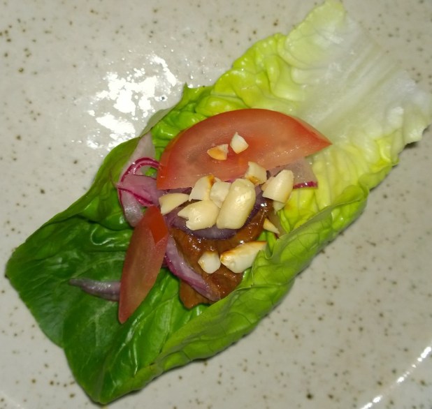 The Lettuce (Iceberg or baby Gem), replaces the Tortilla wrap and forms the container for some Steak, Onion, Tomato and Peanuts, dipping into the Lime and Pepper dressing once rolled up. Its a delicious light, zingy dish, quick to make but amazingly tasty and moorish.