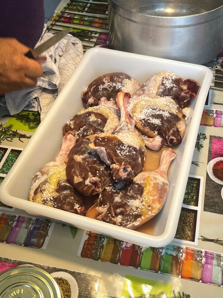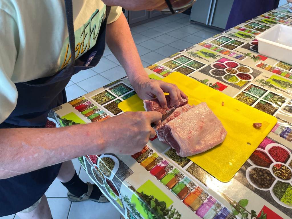 Please excuse the legs as it was hot. Here we are tackling a saddle of lamb, opening it up, carefully removing the central bone and ’tenders’ ready for adding herbs and spices and rolling and tying, before cutting into noisettes ready for cooking, they were very tasty.