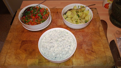 The accompaniments make this special, a simple dressing of Yoghurt and lots of dried Mint, with some Sumac sprinkled on top, and for me, a killer Onion Relish which is dead easy to make, and comes from one of Yotam Ottolenghi’s salad recipes which I have posted before. Thinly slice the Onion and place in a bowl. Dissolve the Sugar in the White Wine Vinegar and add to the onion, mixing well, then add the Rapeseed Oil, using your fingers to blend everything together, then finish by adding the Poppy Seeds and set aside for at least an hour (in the fridge).