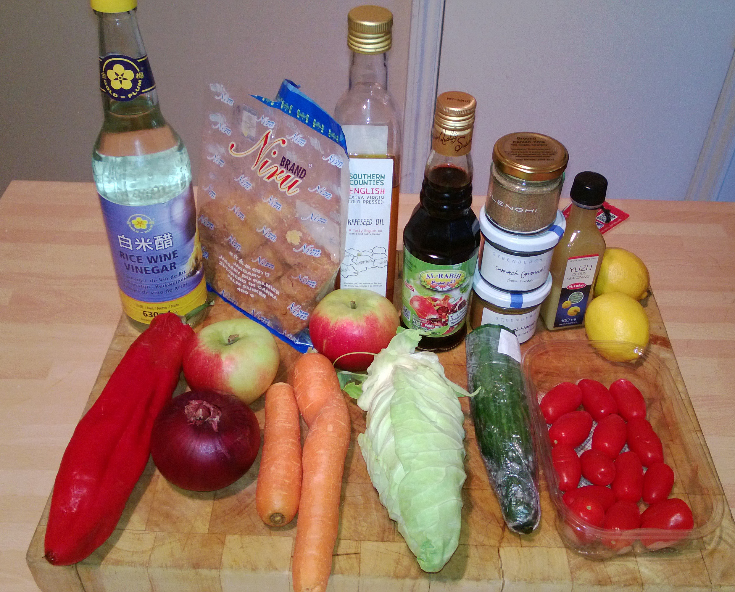 This recipe developed over several hours, and tasting each stage to make sure the balance was right. The final touches need you to mix the Rice Wine Vinegar, Mirin, Soy Sauce (to taste) and Grape Molasses. One 1/2 of the finely chopped Onion is added to the mixture and set aside in the fridge for an hour or so. The other 1/2 of the Onion is fried until crispy and stirred into the final dish. You will notice in the heading picture some Feta cheese, I forgot to add it at the end, DOH.