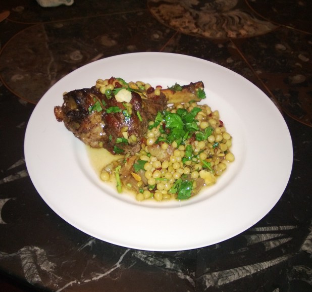 When the lamb is marinated, place in a roasting dish and cover with tin foil, stick in an oven set to 130 deg (fan) 150 deg (convection) and cook for 4 hours till meltingly tender. An hour before the lamb is finished cooking you can start to prepare the rest of the ingredients. Check the cooking instructions on each of the grains, the Maftoul can either be boiled or steamed, the other grains are usually boiled until just tender.