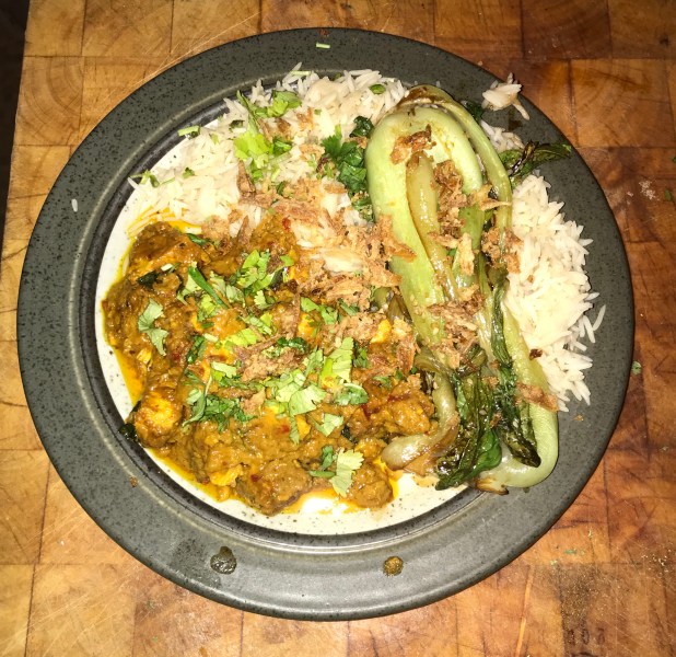 I finished the plate with some Crispy Fried Onions and a sprinkling of Coriander and all was done. It’s a very tasty dish and quite easy to make if you have the ingredients to hand.